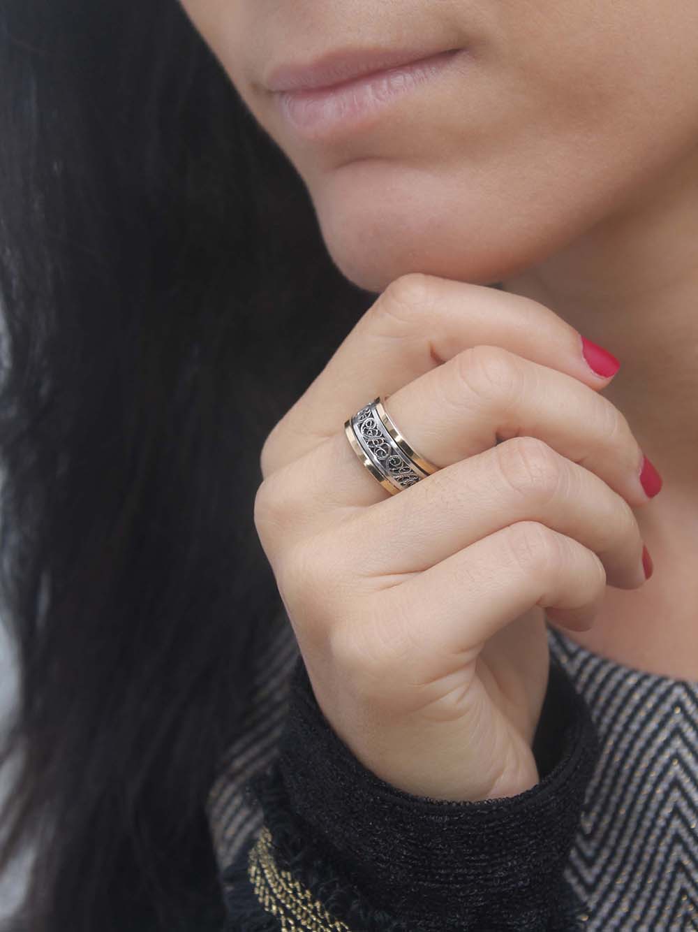 Aliança rotativa em ouro de 9 quilates e prata com a parte central giratória. Peça subtil e delicada. Para as mulheres que gostam de descrição esta será a aliança ideal.